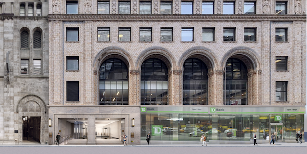 A Lombard Revival style office building designed by John Sloan in association with York & Sawyer and built in 1921-23. Application is to modify an entrance and install signage and lighting.